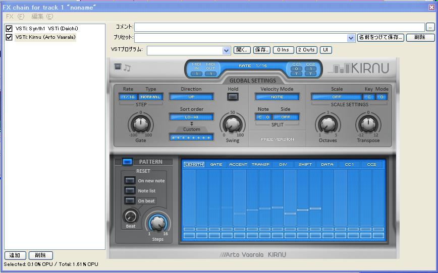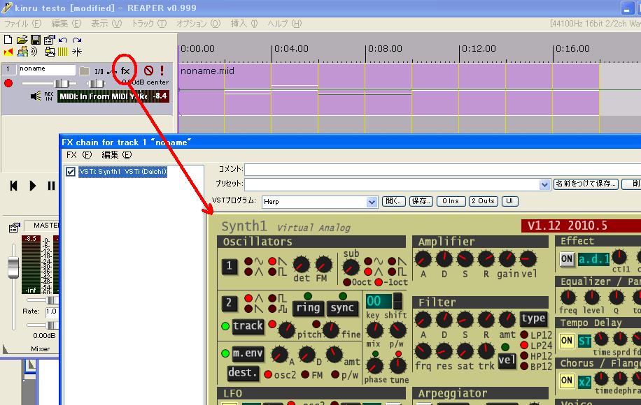 × [PR]上記の広告は3ヶ月以上新規記事投稿のないブログに表示されています。新しい記事を書く事で広告が消えます。 前回はkirnuをVSTHost上で試して見ましたが、リアルタイムでアルペジエーターを鳴らして遊ぶのも楽しいのですが、実際の曲の中に使えるようにしなければならないので、やはりReaperで使えるかをためしてみたいと思います。