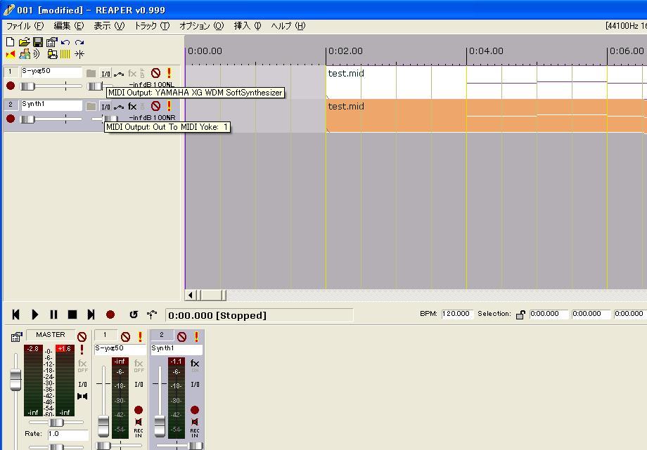 ①REAPERにテスト用のMIDIデータ「ドレミファ」を繰り返した物を挿入したトラックを作ります。YAMAHA S-YXG50で音がなる設定にします。