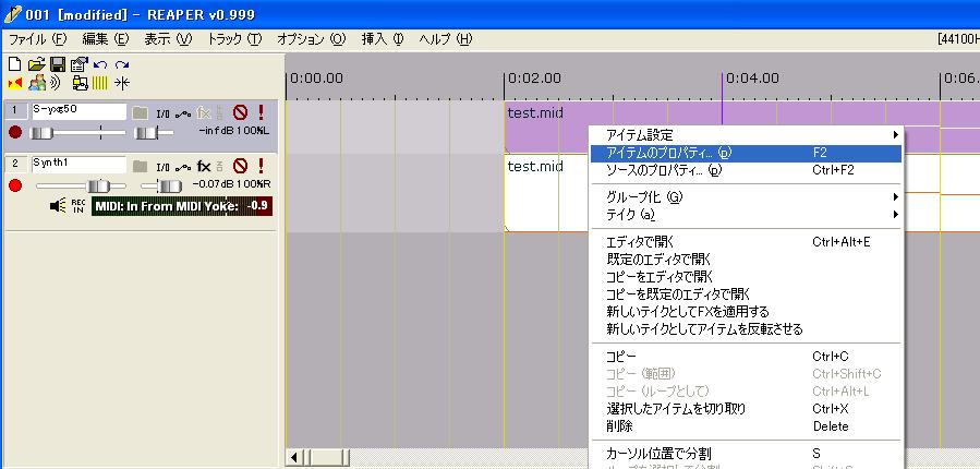 トラック1(S-YXG50)のMIDIデータの上で右クリックし開いたパネルから「アイテムのプロパティー」を選択します。