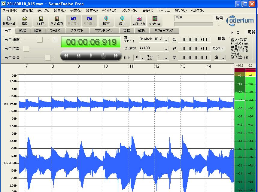 SoundEngine Freeで録音するとこうして波形を見る事が出来ます。