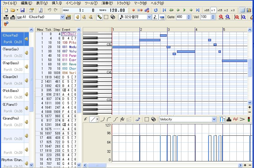 ①を選ぶと前のトラック「ChoirPad」が「TenorSax」が表示されます。
