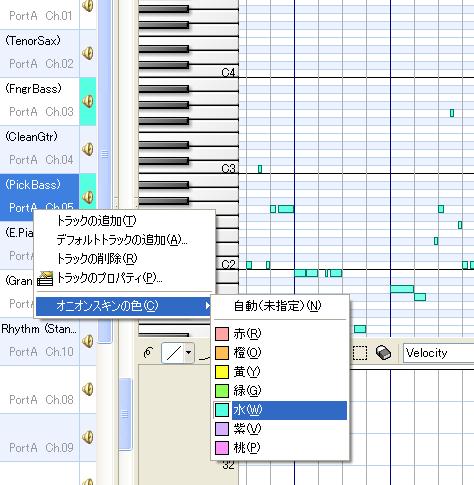 ここでは、ベースの音が2種類入力されていますので、それを同じ色に指定して、