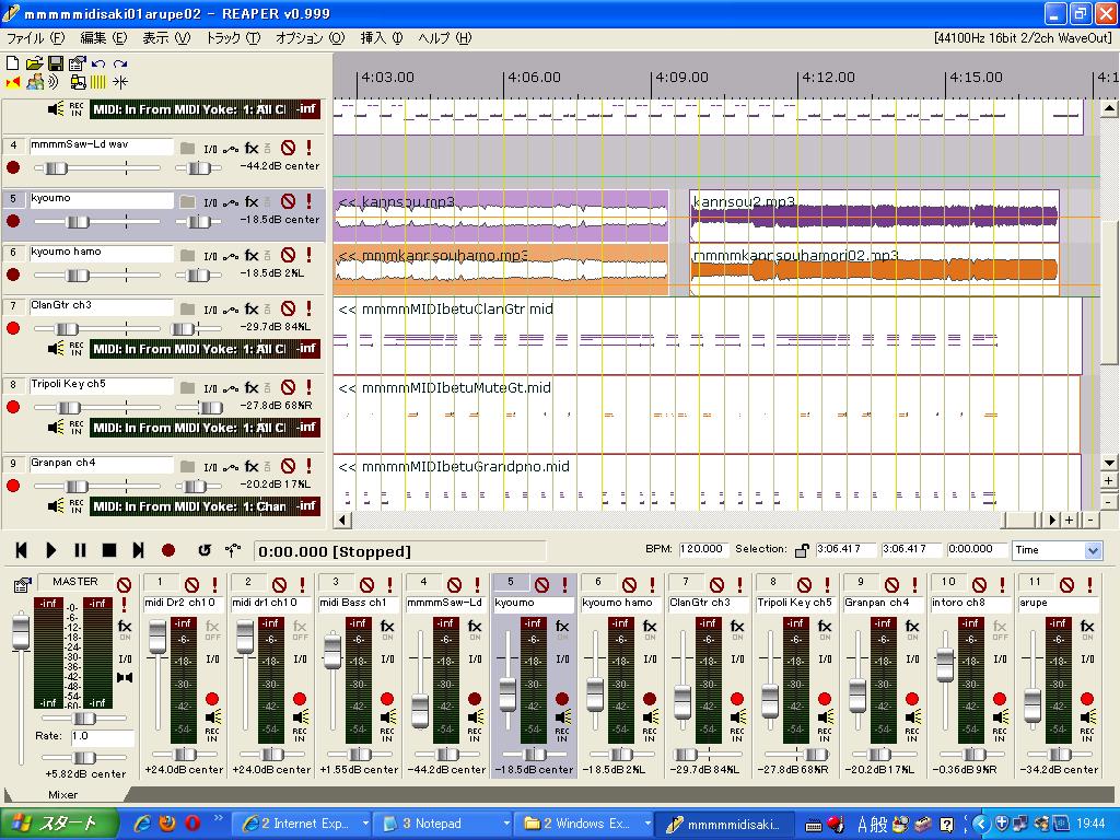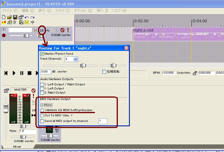 しかし、この状態では再生された音はREAPERの中を通っていないようで、Mixerは反応していません。という事はFXでエフェクターをかけることも出来ないわけです。 トラックを追加して、そこに音声を送り、その音声にFXからエフェクトをかけることには成功したのですが、エコーのように反響する症状を改善できないため、S-YXG50の音にFXでエフェクトをかけて使用する方法は諦めました。 現在はXGの音はそのまま使うか、一旦録音し、MP3に変換してトラックに埋め込んで使用する方法を使っています。