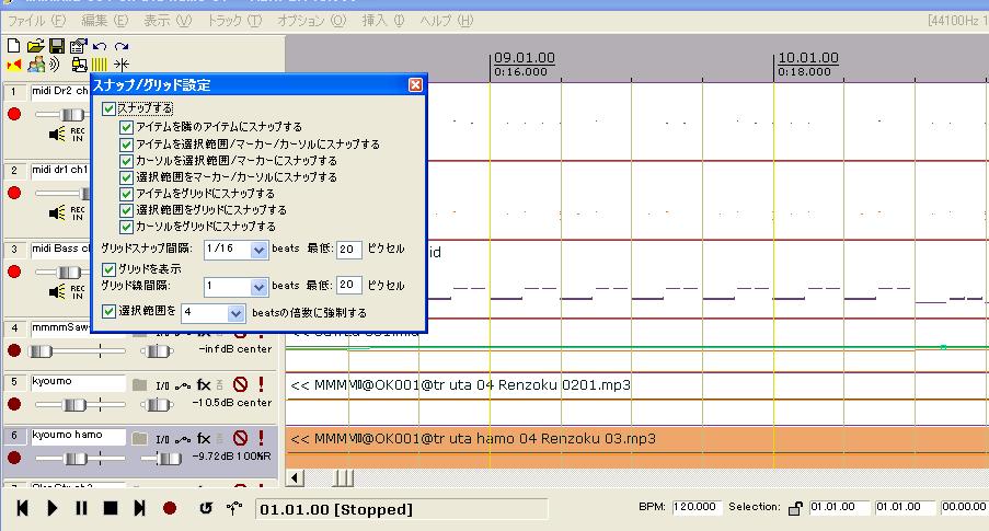 細かいタイミングを あわせたいときにもっと細かく出来ないか気にはなっていたのですが、最近気がつ いてのでメモしておきます。 上の段にアイコンが何個か表示されていますが、その中にストライプのアイコンを 押すと小節のを区切る線が引かれますが、このアイコンを右クリックするとスナッ プ・グリットの設定が出てきます。 この中のグリットを表示の中の「グリット線間隔」で細かく表示が変えられること がわかりました。 設定は 4、2、1、1/2、1/3、1/4、1/8、1/16、1/32の中から選ぶ事が出来ますが 、1/32にするときは 最低の設定を20以下にする必要があります。 画像は 1/32で最低1ピクセルに設定してみました、細かすぎて通常の設定には向 きませんでした。 今後は1/16に設定して作業していきたいと思います。 PR REAPERをヤマハの音源S-YXG50で鳴らしてみます。 REAPERを導入して最初に試したのが、MIDIデータをS-YXG50で鳴らすことでした。